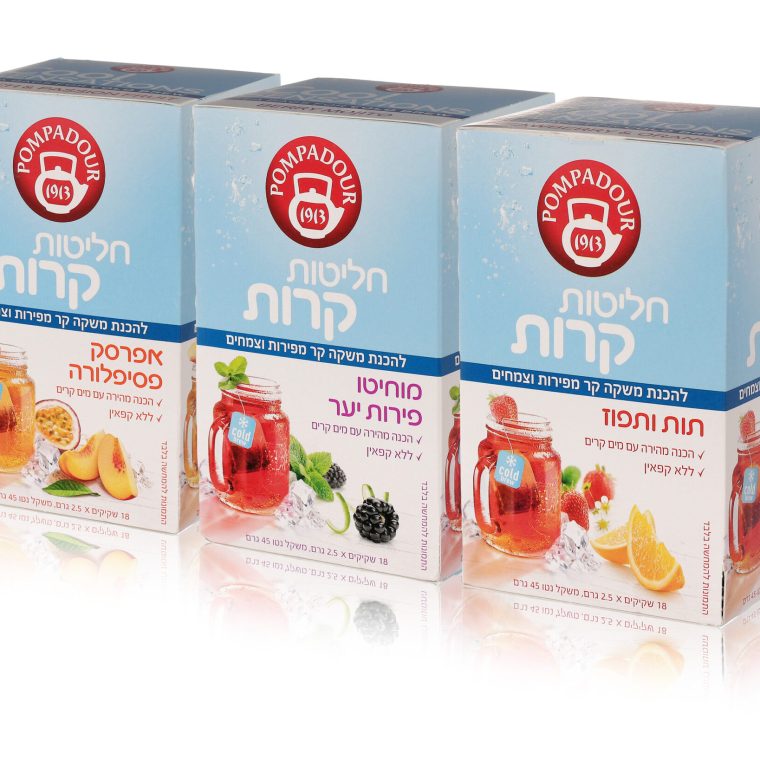 סדרת החליטות הקרות של פומפדור כוללת שלושה טעמים מרעננים: מוחיטו פירות יער, תות-תפוז ואפרסק-פסיפלורה